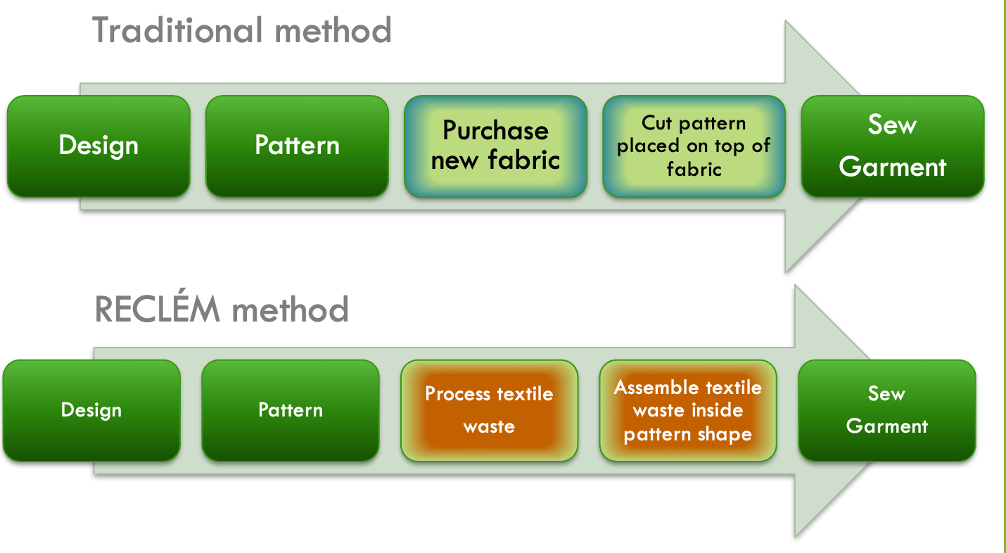 For over 100 years, the traditional method below has been a standard for industrial design and production of textile goods. The RECLÉM rescue textile waste method is shaking up that arrangement. It keeps part of the traditional process and replaces two key phases – exchanging purchasing new fabric for processing textile waste, and instead of cutting the pattern placed on top of the fabric, the RECLÉM rescue textile waste method allows the designer to create a new textile by “painting” with textile waste inside of the pattern shape.